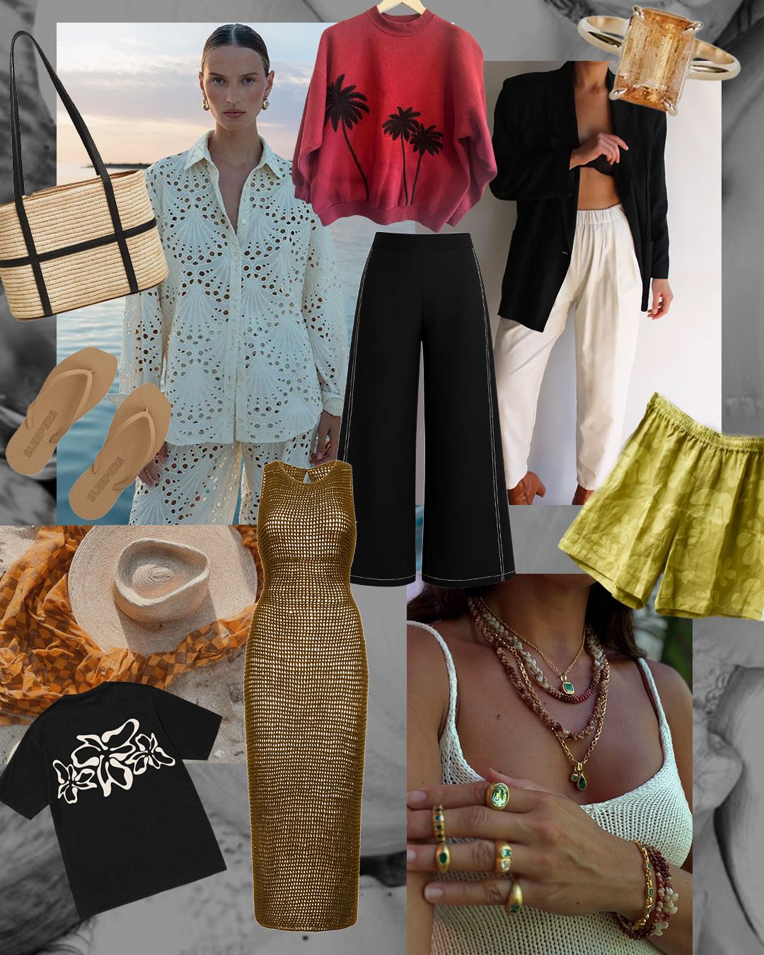 Bask Hawaii day bag is still perfectly totable for fall // This shirt from Nuage Bleu with shell roderie details, please // On a Wing and a Prayer pieces just dropped at Olive Boutique and we’re swooning over this palm-embroidered sweatshirt (and everything else) // Jaxsea cotton-linen vacation pant in black is comfy-chic perfection // And these Na Nin raw silk pants from Here. The Store too // The simplicity, the color, the wow of this emerald-cut topaz ring from Wings Hawaii // At Dawn casual flower shorts with white side stripe to pair with a swimsuit and/or relaxed button-down shirt // A dreamy mix of heirloom shell pieces and colorful jewels from Nohona Kauai // Acacia Ronin dress because we want everything crochet ATM // A chic tee and fresh take on hibiscus-print from M3N3HUN3 // Olympia Etal just re-released some coveted colorways of the Wyeth Sarong and we’re partial to this mango hue // Square-toed Sleepers slippers from Bikinibird for every damn day